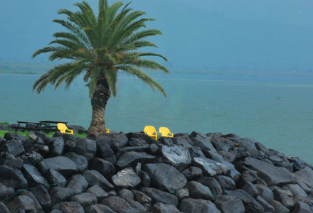 Sonnige Stühle trotzen dem Regen am See Genezareth. |